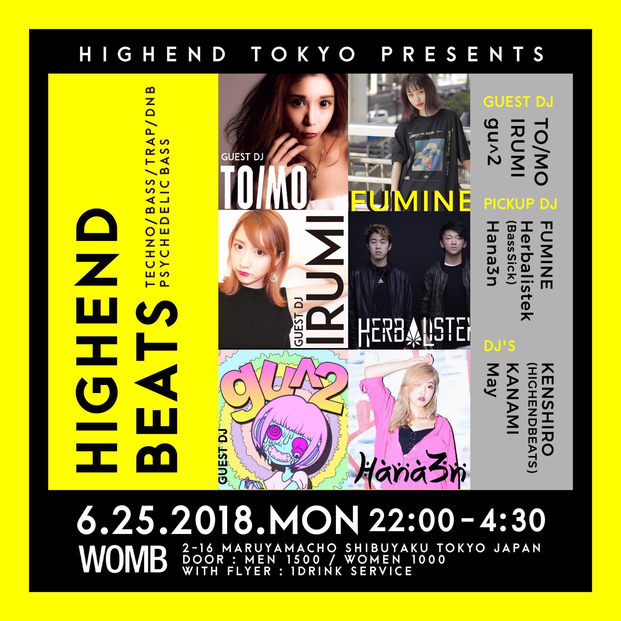 HIGHENDBEATS では、よくクラブでかかる音楽など皆無、いわゆるオープンフォーマット DJ はこのイベントには存在しません。そのためオープニングアクトからお楽しみいただけるであろう、自身で Remix や楽曲制作を行っているアーティスト DJ 軍を揃え、他では味わえない選曲の展開でお送り致します! MAIN FLOOR では TECHNO、BASS MUSIC、TRAP、DRUM&BASS、そして Psychedelicbass を織り交ぜた EDM で他では聴けない選曲を ON AIR! そしてその WOMB を普段とは一味違うサイケデリックな空間に仕上げ、そして非現実的な音楽で、まさに WOMB でしか味わえないクオリティでお届けします! まだ誰も味わったことのない新感覚なパーティーを是非、体感してください!