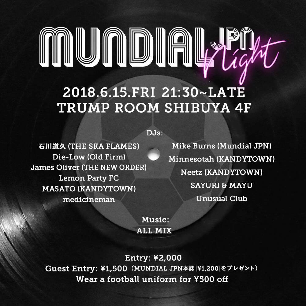 - Door: ¥2000 / FB Guest: ¥1500 (¥500 off if you're wearing a football shirt)