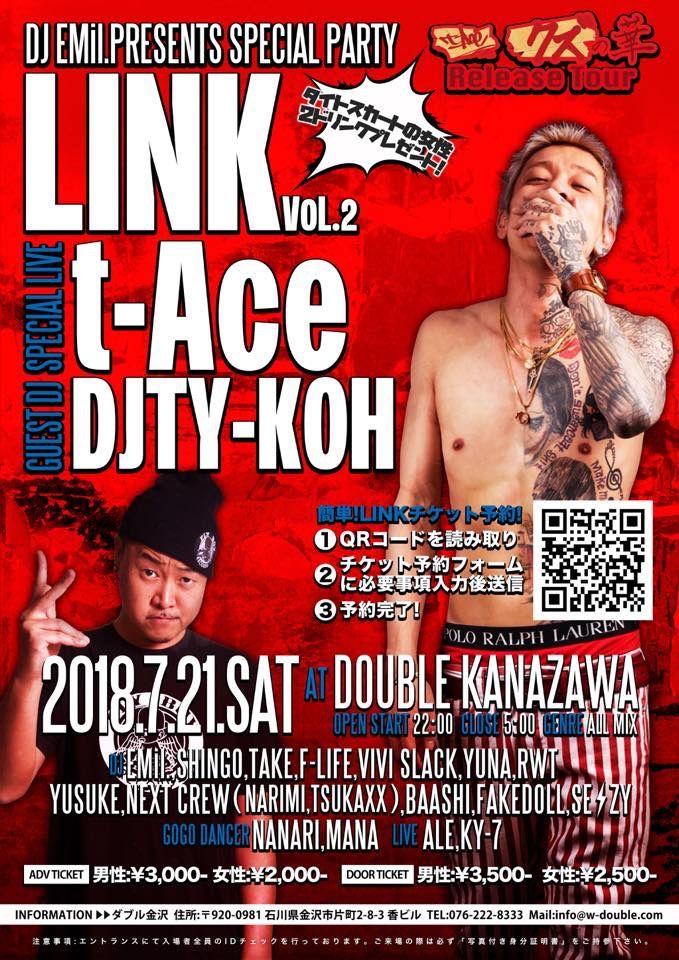 県内で活躍中のDJ EMil.主宰の大人気イベント“LINK”が、ラッパー“t-Ace”のクズの華リリースパーティー IN 金沢として盛大に開催決定!!!