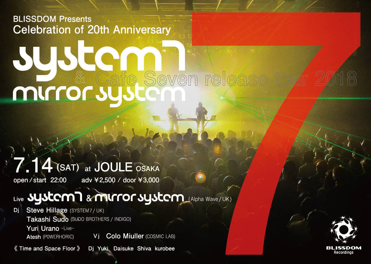 SYSTEM7 & Mirror System 、2つの名義にてエレクトリック・ミュージックシーンを網羅するスティーヴ・ヒレッジとミケット ・ ジラウディ の2人。 彼らの音楽的エッセンスが全てが詰まったアルバム『System 7 & Mirror System / Cafe Seven 』のリリースを記念して、今年20周年を迎えるBLISSDOM とのアニヴァーサリー・パーティーを開催いたします。System 7 & Mirror System による 2時間以上に及ぶサウンドジャーニー、アルバム収録曲 SUDO「 Sensation (SYSTEM 7 Remix)」 の"SUDO BROTHERS" 兄Tatakashi によるDJ Set、次世代エレクトロニック・クリエイターオーディション「INTERLUDE from TDME」でグランプリに輝いた 大阪出身のYuri Urano によるスペシャルライブ、VJ は、高野山や天河神社、遺跡にプロジェクトマッピングを実施し話題になったColo Muller など、力強くも美しいサウンド/ アートに包まれるスペシャルな夜をお過ごしください!!