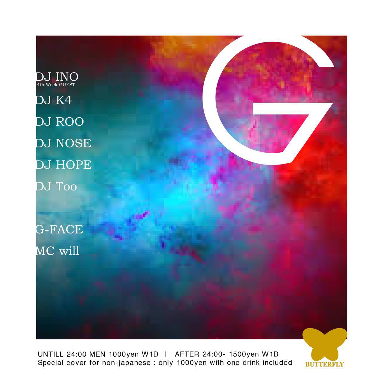 - Special cover for non-japanese : only 1000yen with one drink included / 【平日(日曜日から木曜日)】 <22時から24時まで> 男性 1000円(1ドリンク付), 女性 1000円(1ドリンク付) <24時から3時まで> 男性 1500円(1ドリンク付), 女性 1000円(1ドリンク付)