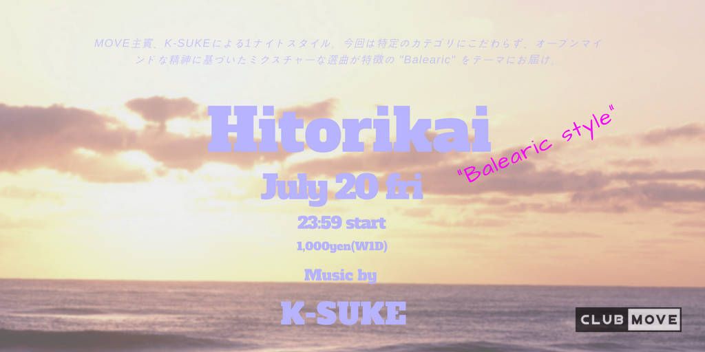 MOVE主賓、K-SUKEによる1ナイトスタイル。今回は特定のカテゴリにこだわらず、オープンマインドな精神に基づいたミクスチャーな選曲が特徴の "Balearic" をテーマにお届け。