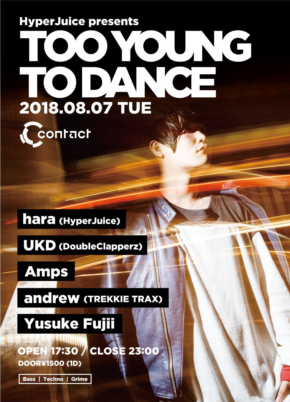 今回もHyperJuiceはContactとマッチするhara名義で登場。ゲストDJに"TREKKIE TRAX"からのリリースや英国国営放送、BBC Radio1へのミックス提供など活動の幅を世界へと広げるAmps。東京を拠点とするグライム・ユニットDoubleClapperzから日本とUKをつなぐキーマンUKD。そして、TREKKIE TRAXからandrew等、今回も層の厚いラインナップを用意。