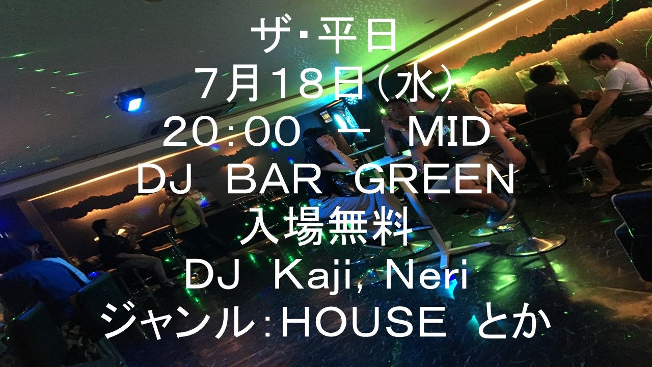2018.07 18 JUL ザ・平日 HOUSE TECHNO TOP40 DISCO 0 Shares Facebook Twitter google Line DATE: 2018-07-18 WED OPEN: 20:00 VENUE: PRICE: FREE LINE UP: DJ KAJI DJ NERI 平日のHOUSE MUSICを中心としたイベント。