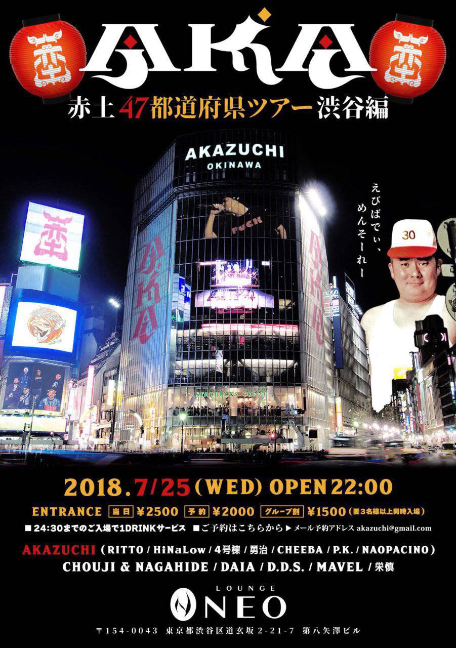 - 当日: 2500YEN 予約:2000YEN( ✉akazuchi@gmail.com ) グループ割:1500YEN(3名様以上同時入場) ★24:30までのご入場で1DRINKサービス