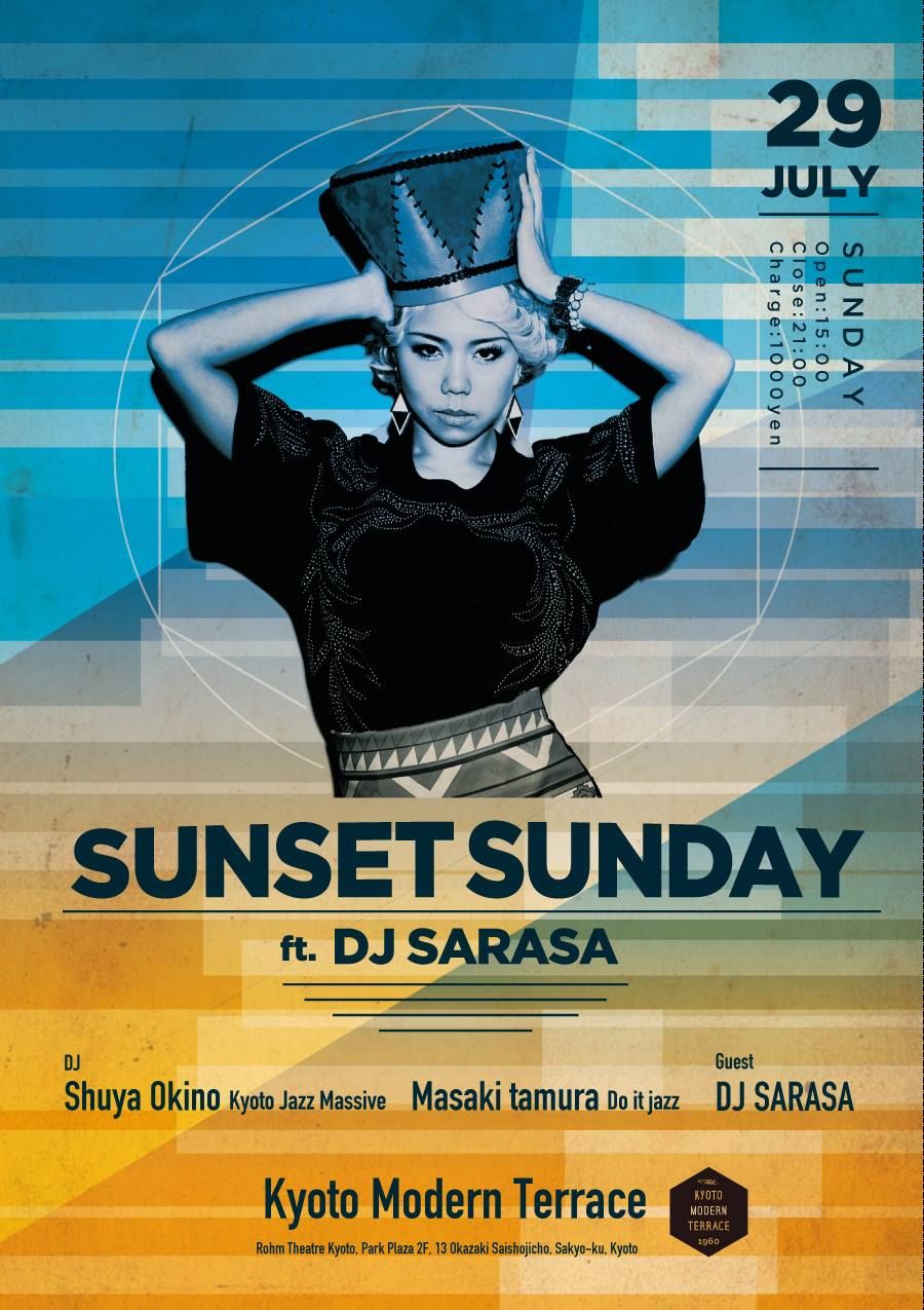 2016年京都岡崎のロームシアター京都にオープンした京都モダンテラス。前川國男が設計した(リノベーションを経て保存)伝説のモダニズム建築にホールや蔦屋書店と共にオープンし、新鮮な息吹を吹き込んだ。京都のニュー・フェイスとして観光客のみならず、地元からも熱い注目を集めている。そんな話題のスポットで、7年前に京都に戻り、数々のホテル、ゲスト・ハウス、バー、カフェ、ナイト・クラブでイベントを手掛けて来たKyoto Jazz Massive沖野修也が、最終日曜の夕暮れ時に大人の為のパーティーを始動。題してSunset Sunday。2階であるのに視界180度が完全オープン・エアという世界でも屈指のロケーションは最高のインテリアでもある。平安神宮と京都市美術館を両脇に、東山を一望できるこのテラスを使い、ジャズやソウル、R&Bやハウスを織り交ぜたクロスオーバーな選曲で、"オール・ナイト"を卒業した音楽好きとダンス好きが集える空間を演出。これは京都でしか経験できない"新しくて楽しい休日の過ごし方と夜遊び"の提案でもある。