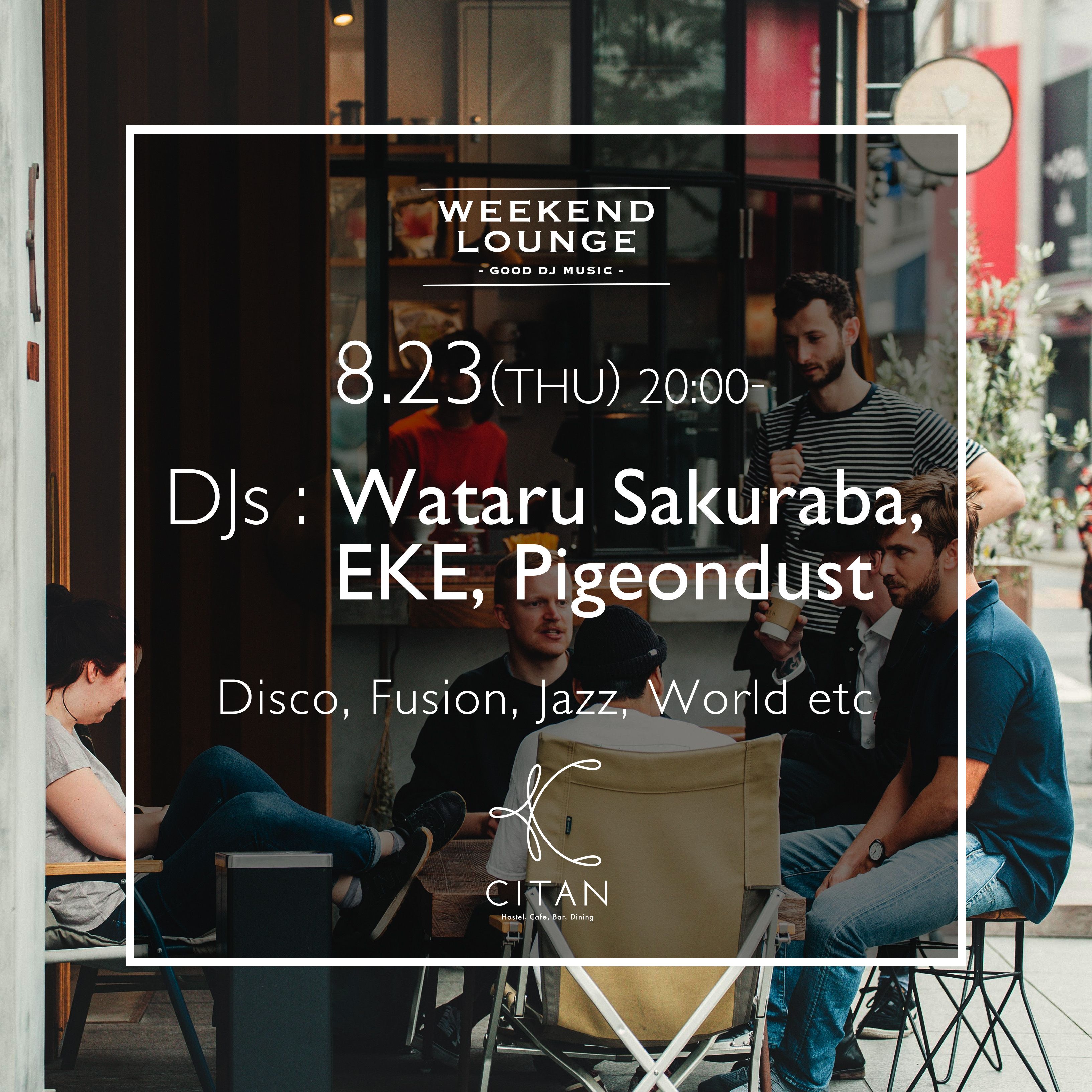 2018.08 23 AUG Weekend Lounge DJs DISCO JAZZ FUNK SOUL HOUSE 0 Shares Facebook Twitter google Line DATE: 2018-08-23 THU OPEN: 20:00 VENUE: PRICE: ENTRANCE FREE LINE UP: Wataru Sakuraba, EKE, Pigeondust 8/23 (THU) DJ:Wataru Sakuraba, EKE, Pigeondust GENRE:Disco, Fusion, Jazz, World etc