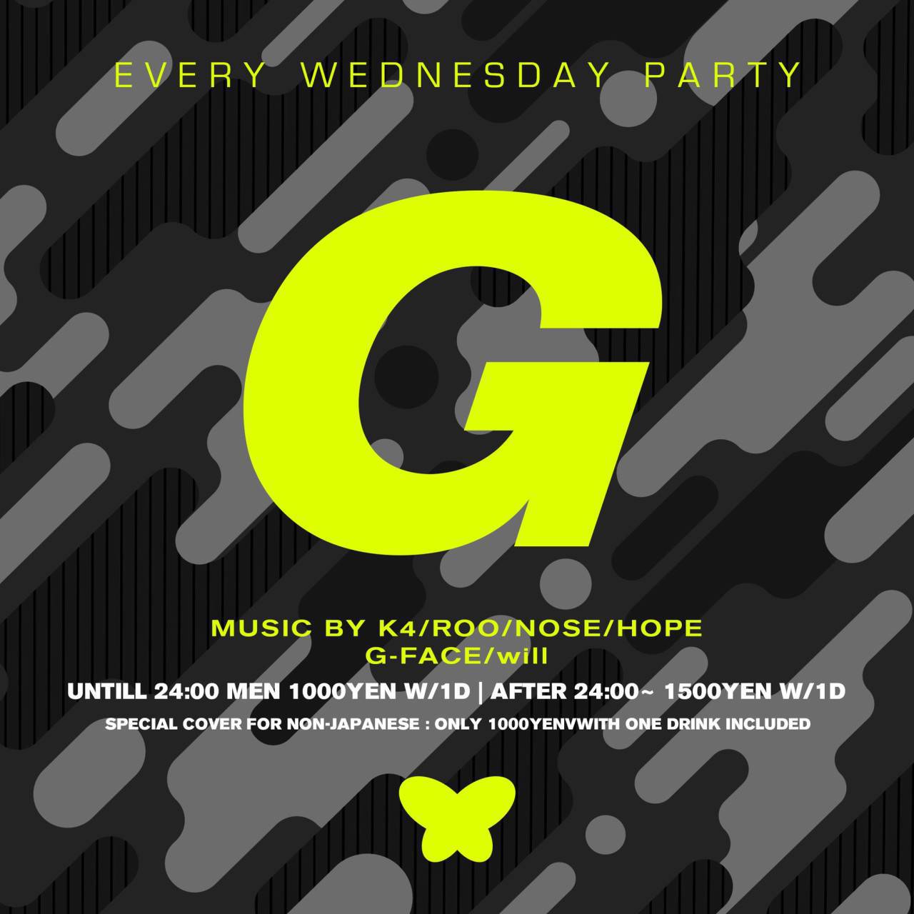 - Special cover for non-japanese : only 1000yen with one drink included / 【平日(月曜日から木曜日)】 <22時から24時まで> 男性 1000円(1ドリンク付), 女性 1000円(1ドリンク付) <24時から3時まで> 男性 1500円(1ドリンク付), 女性 1000円(1ドリンク付)