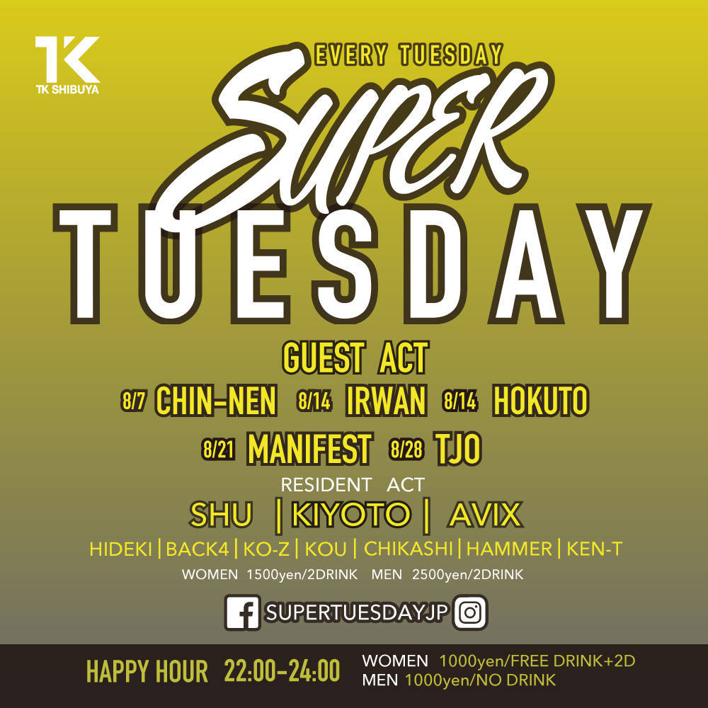 東京の遊びの中心「渋谷」の新たな遊び場「TK SHIBUYA」が、毎週火曜日に開催するパーティー「SUPER TUESDAY」!この「スパチュー」ではEDMは勿論、HIP HOPやベースMUSIC等、今、世界で主流の音楽がジャンルレスに体感できる!豪華なレギュラーDJ陣に加え毎週多彩なゲストDJを招き、他の平日では味わえない最高の夜をお楽しみ頂けます!