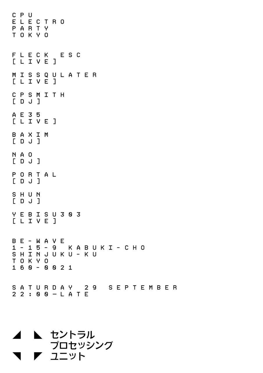 CPU からはオーナーの CPSmith に加え、"They Rave Us" [00010000] や "Remixes" [00110010] にも参加の Missqulater と、先日 "Discrete Opinion" [00111111] をリリースしたばかりの Fleck E.S.C が出演。