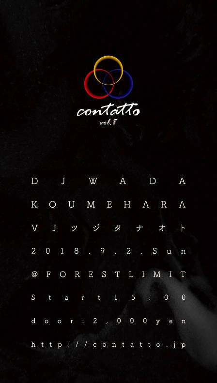 テクノレジェンドDJ WADAと鬼鋭KO UMEHARAによるレギュラーパーティー「contatto」。約1年ぶりの開催となる今回はDJ両名に加えDJ WADAのofficial PVや本パーティーのPVを作成したVJツジタナオトが今までの音による「contatto」(イタリア語でcontact)に光での参戦をし、フロアと更なる化学反応を起こすべく実験を試みる。