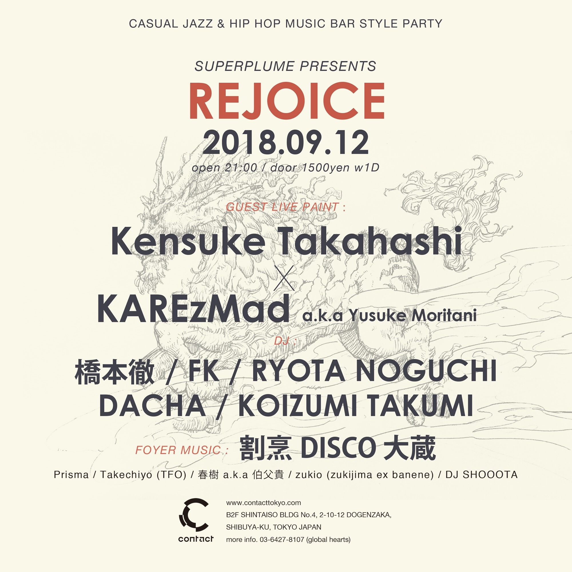 Rejoiceは選曲家 橋本徹、Nujabesのマネージャーやレーべルマネージメントを務め、現在は"Roph Recordings"をマネージメントするKoizumi Takumi、"Hydeout Productions"の旗艦店Tribe (+"Guinness Records") からリリースし、同店のスタッフでもあるFKを中心に、腕利きのセレクターが音楽を担当する。「等身大かつ自分達にとってリアルなジャズやヒップホップ」「本当に音楽を愛する人たちが安心して和める場所」をコンセプトに掲げ、ジャズ、ヒップホップを中心に良質な音楽を気ままに楽しめるイベント。