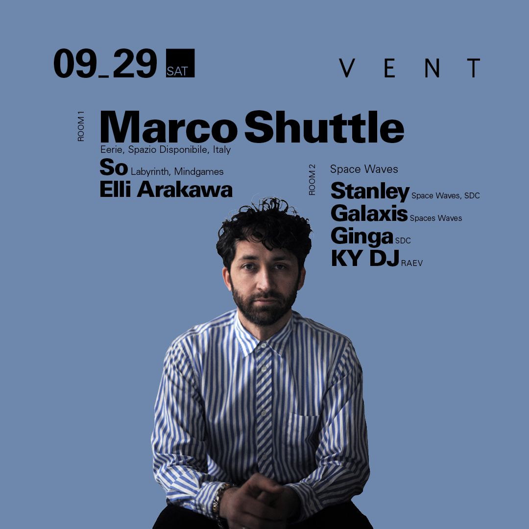 また今回メインフロアでサポートするのはモデルでありながら国内アンダーグラウンドシーンでも高い評価を得るElli Arakawaと、Labyrinthや海外共演でも彼とのコネクションが強いSo。また2nd ROOMはこれまで上海、東京で不定期開催をして来たSpace Wavesの面々がメインフロアとは趣の異なるジャンルレスな音楽をお届けする万全の布陣で迎える。VENTの妥協なきサウンドシステムから繰り出されるMarco Shuttleのシネマティックなテクノサウンドを是非体感して欲しい。