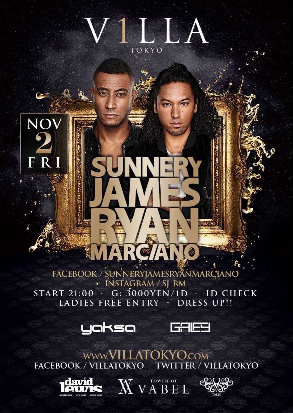 11月2日(金)ファンキーハウス、トライバルサウンドで音好きを虜にしているオランダ出身のデュオDJ/プロデューサーSunnery James & Ryan Marciano(サナリー・ジェームズ & ライアン・マルシアーノ)がVILLA TOKYOに初登場!