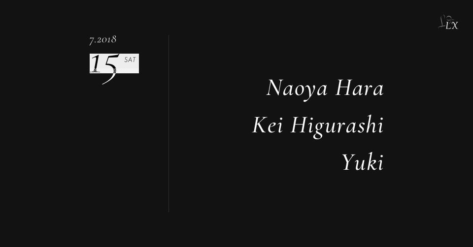 2018.09 15 SEP Studio LX TECHNO HOUSE MINIMAL 0 Shares Facebook Twitter google Line DATE: 2018-09-15 SAT OPEN: 22:00 VENUE: PRICE: Free LINE UP: Naoya Hara,Kei Higurashi,Yuki https://www.facebook.com/events/1890911857663343/