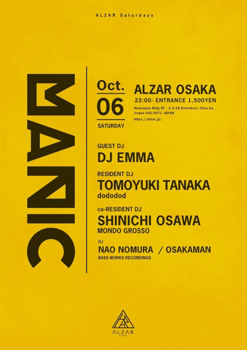FPMの田中知之がストイックにダンスミュージックと向き合うことを目的としてスタートさせた別プロジェクトdododod(ドドドッド)オーガナイズによる 〜ALZAR SATURDAYS 〜『MANIC』。今年の3月3日、5月5日、7月7日の3度の開催はいずれも満員御礼にて大成功を収め、近年のダンスミュージック・シーン界隈の閉塞感を見事なまでに吹き飛ばし、もはや関西を、いや日本を代表するパーティに成り上がったと言っても過言ではないだろう。特に全ゲスト揃いぶみのB to Bで朝を迎えるラストのフロアの多幸感は、ダンスミュージック〜クラブが本来あるべき姿を改めて体現していると言えよう。そして10月6日(土)に待望の第4回目の開催が決定した。レジデントの田中知之、co-レジデントの大沢伸一 (MONDO GROSSO)に加え、今回ゲストに迎えるのは、日本DJ界を牽引し続ける"KING OF HOUSE" =DJ EMMA 。脇を固めるのはBASS WORKS RECORDINGSのNAO NOMURAとOSAKAMAN。日本が世界に誇る【ALZAR】の超絶サウンドシステムに抱かれた、ダンスミュージック・ラヴァー垂涎の桃源郷へ是非お越しあれ。
