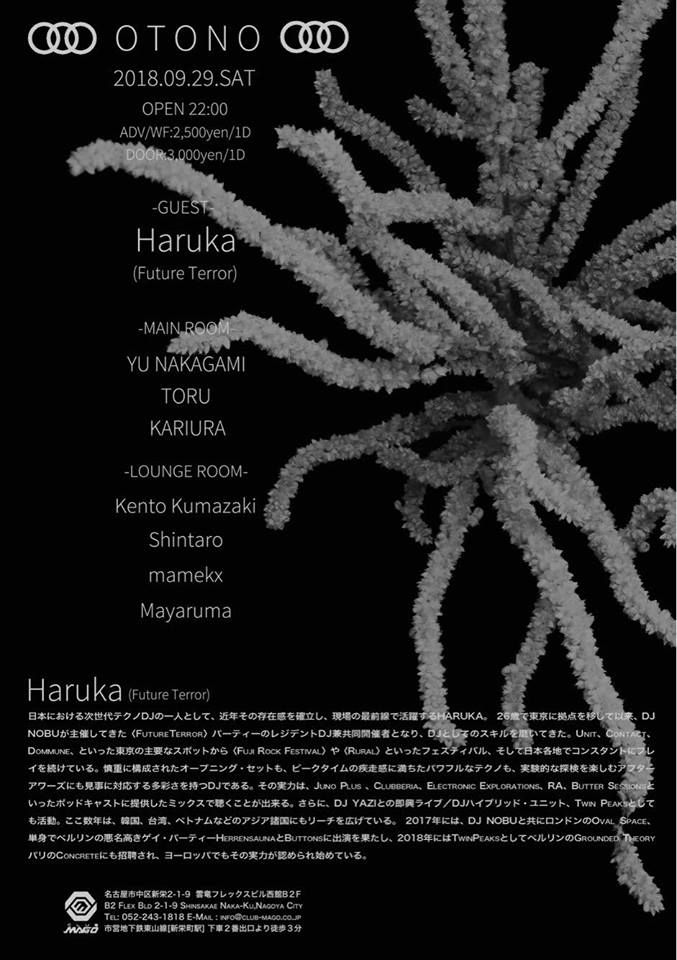 日本における次世代テクノDJの一人として、近年その存在感を確立し、現場の最前線で活躍するHARUKA。 26歳で東京に拠点を移して以来、DJ NOBUが主催してきた〈Future Terror〉パーティーのレジデントDJ兼共同開催者となり、DJとしてのスキルを磨いてきた。Unit、Contact、Dommune、といった東京の主要なスポットから〈Fuji Rock Festival〉や〈Rural〉といったフェスティバル、そして日本各地でコンスタントにプレイを続けている。慎重に構成されたオープニング・セットも、ピークタイムの疾走感に満ちたパワフルなテクノも、実験的な探検を楽しむアフターアワーズにも見事に対応する多彩さを持つDJである。その実力は、Juno Plus 、Clubberia、Electronic Explorations、RA、Butter Sessionsといったポッドキャストに提供したミックスで聴くことが出来る。さらに、DJ YAZIとの即興ライブ/DJハイブリッド・ユニット、Twin Peaksとしても活動。ここ数年は、韓国、台湾、ベトナムなどのアジア諸国にもリーチを広げている。2017年には、DJ NOBUと共にロンドンのOval Space、単身でベルリンの悪名高きゲイ・パーティーHerrensaunaとButtonsに出演を果たし、2018年にはTwin PeaksとしてベルリンのGrounded Theory、パリのConcreteにも招聘され、ヨーロッパでもその実力が認められ始めている。