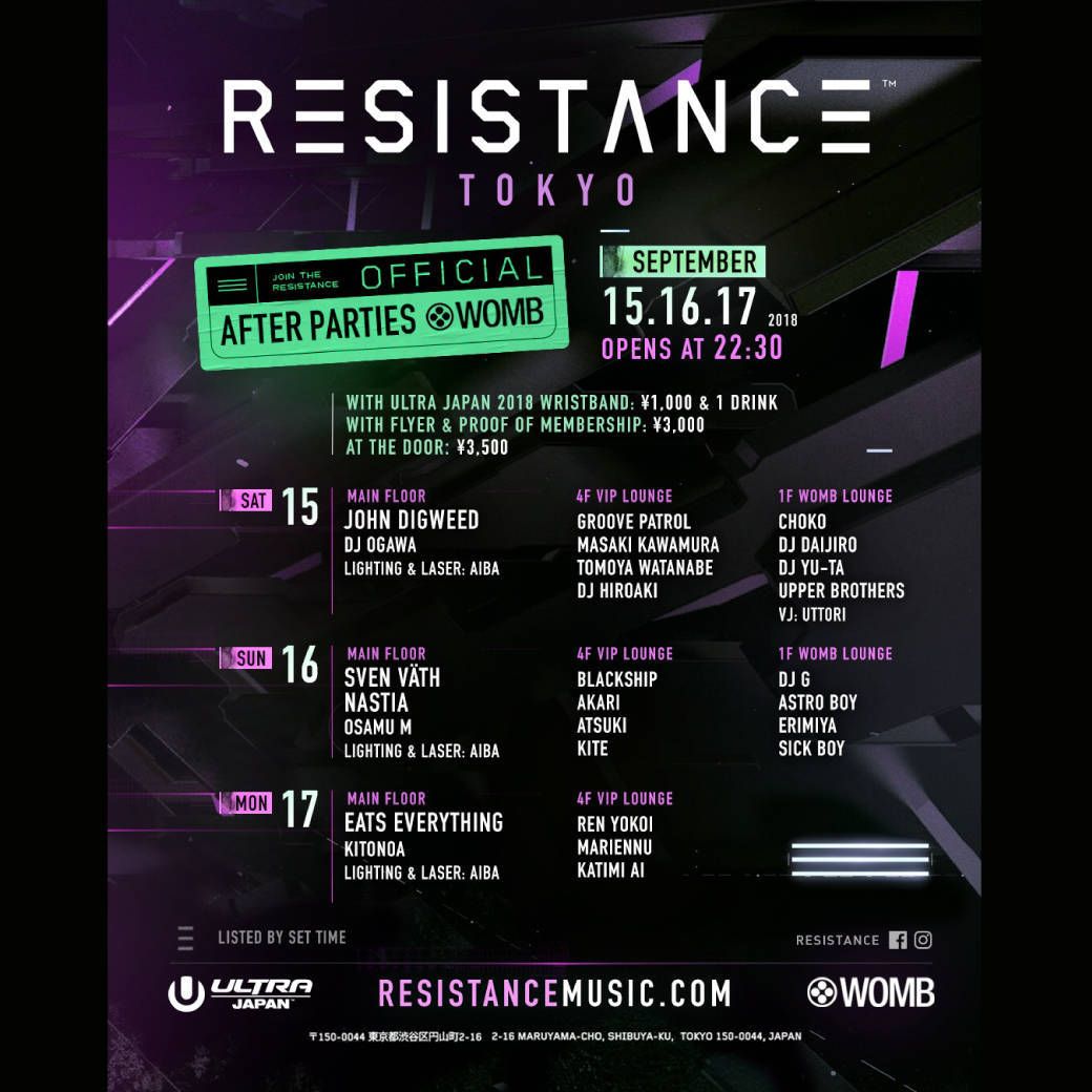 そして、”RESISTANCE” のオフィシャル・アフターパーティーが WOMB で9月15日(土)・16日(日)・17日(月・祝)の3日間で開催決定!