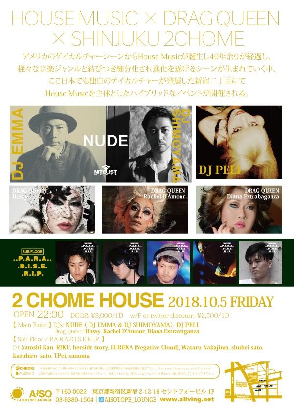 アメリカのゲイカルチャーシーンからHouse Musicが誕生し40年余りが経過し、様々な音楽ジャンルと結びつき細分化され進化を遂げるシーンが生まれていく中、ここ日本でも独自のゲイカルチャーが発展した新宿二丁目にてHouse Musicを主体としたハイブリッドなイベントが開催される。