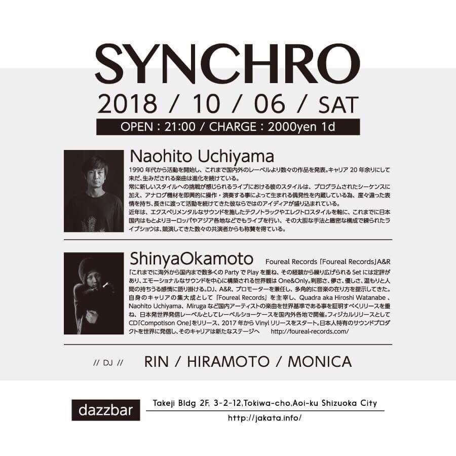 2018.10 06 OCT SYNCHRO TECHNO HOUSE MINIMAL 0 Shares Facebook Twitter google Line DATE: 2018-10-06 SAT OPEN: 21:00 VENUE: PRICE: DOOR:¥2000 LINE UP: [Live],Naohito Uchiyama,[DJ]Shinya Okamoto,Rin,Hiramoto,Monica https://www.facebook.com/FourealRecords/