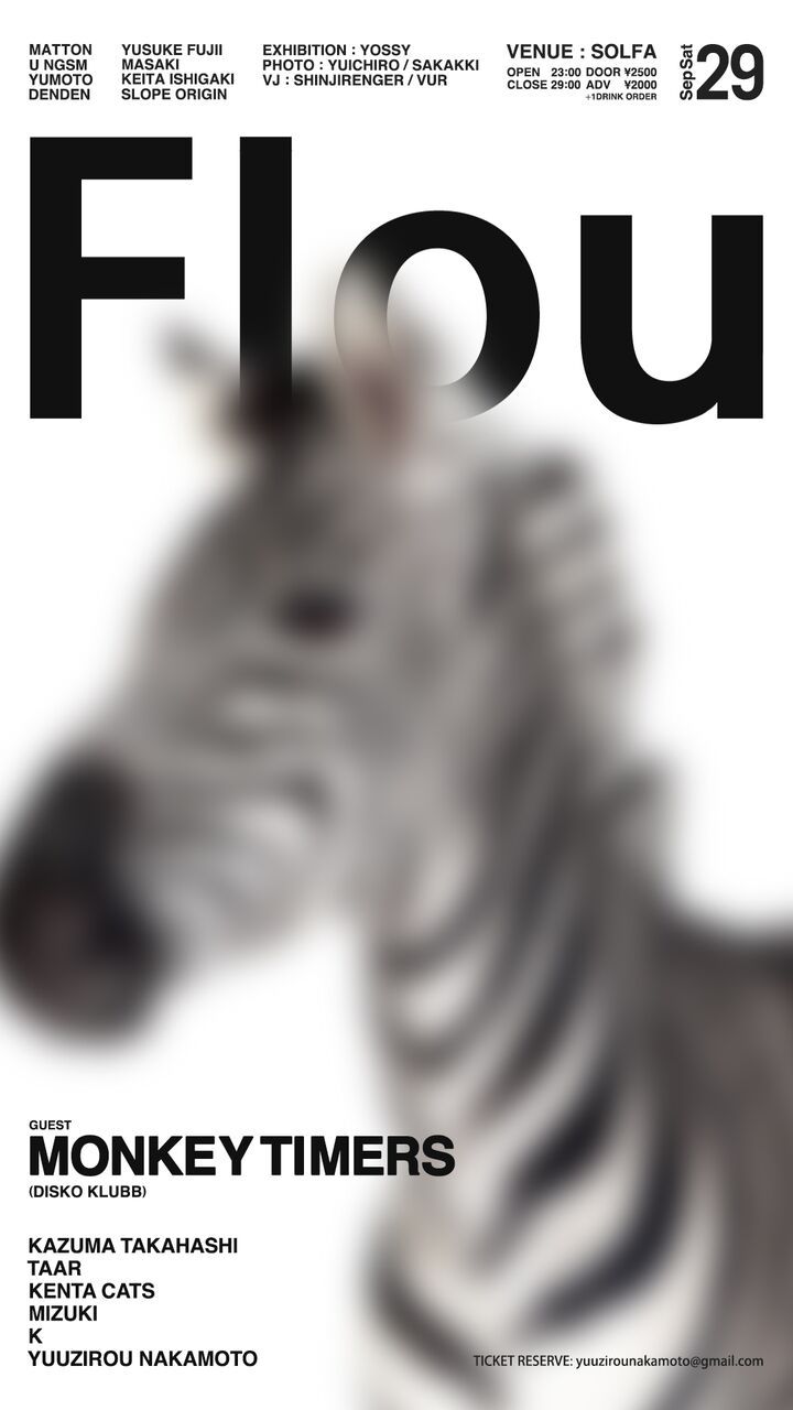 2018年9月29日(土曜)solfa Tokyoにて、TakeとHisashiによるDJユニット・Monkey Timersをゲストに迎えた、ディスコ/テクノを提唱するイベント<Flou>が開催される。