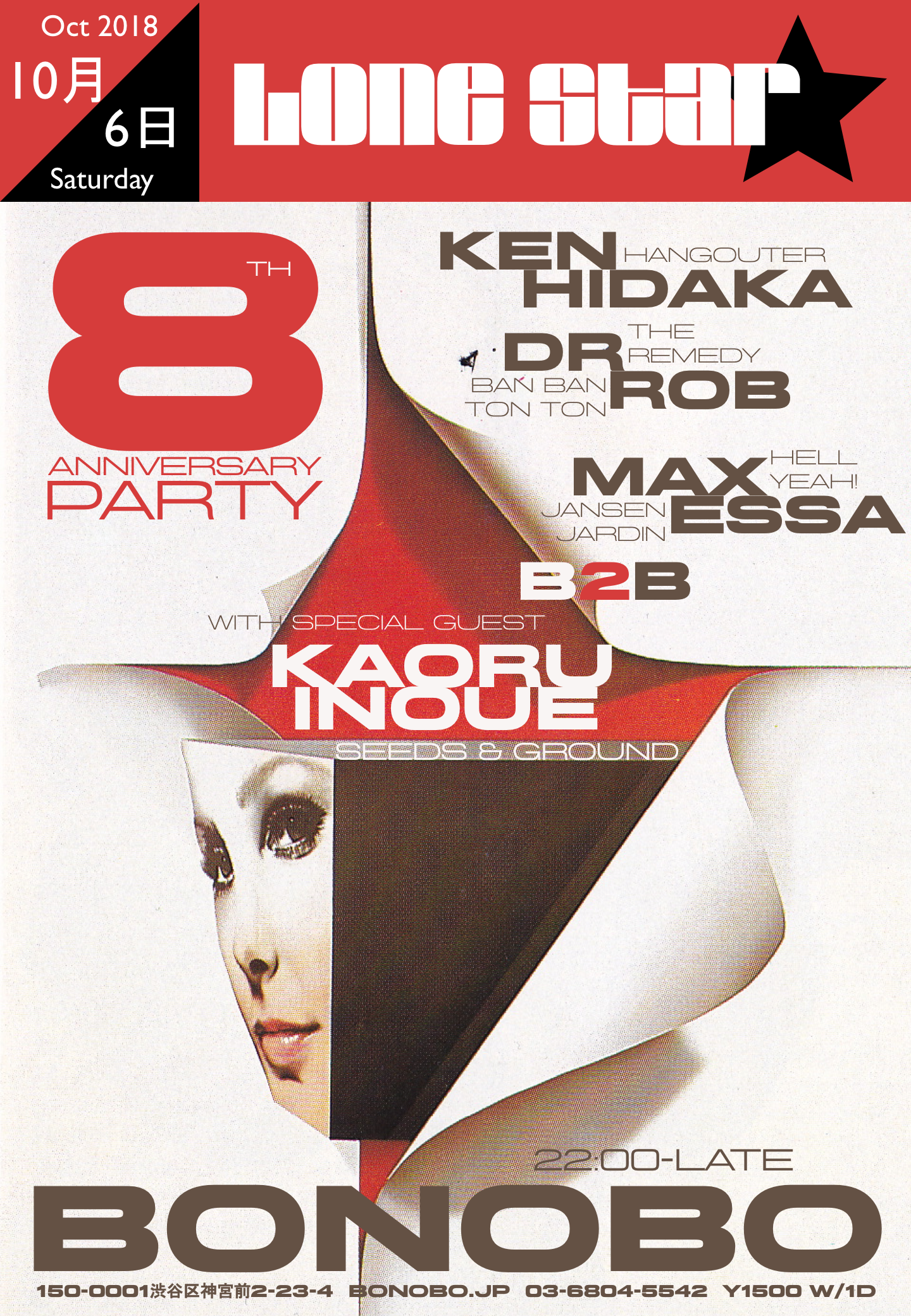 確かに、8年以上前にフィル・マイソンの紹介で、今や亡きバージャムでパーティをやっていたロブと初めて知り合い、それからゴーディ、ガイ、そしてマックスと出会った。ボノボでパーティをやらないかというアイデアを彼らに提案した。ハーヴィが超久々に来日した時Elevenで皆と会った時に話しをし、EADの近くの喫茶店でミーティングを後で開き、たまたまガイがLONE STARというテキサス州かビールの銘柄のTシャツを着て、「いい名前だな〜」と思い、名付け、パーティ名をその場で決め、スタートした。最初から持ち味であるバレエリックな旋風をボノボに注入しつつ、我々の仲間、好きなDJや先輩達、ノリさん、アゲイシさん、矢部さん、ニック、ケンジさん、池田さん、アレックス、マーク・セブン、Hell Yeah!のマルコなどの重鎮DJをゲストに招きつつ、幸い何十回も、毎月第1土曜日Lone Starをやり続けた。あっという間でしたね。いつの間にか、ボノボの長寿パーティの一つとなった。Lone Starメンバー、誰一人もこんなに長くに渡り、パーティをやり続けたことがないそうで、個人的にはみんなと月一ボノボでパーティ出来て、幸せだ。今回の8周年を盛大に祝うため、重鎮Kaoru InoueをゲストDJとして招いた。そして、周年パーティならではの特別な、決して誰一人も見逃すべきではない、素晴らしい仕掛けを用意させて頂きました!去年のフリーダム・サンセットの時、鮮烈なバック2バック・プレイを繰り広げたダイナミック・デュオである薫さんとマックスが、今回ボノボで、Lone Starで披露し、体感出来る!これは大事件だと思う!
