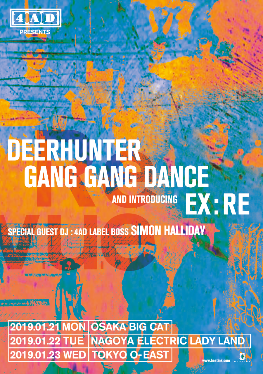 2019年1月に大阪・名古屋・東京で開催を予定していた最重要インディレーベルの一つ4ADのショーケース・イベント『4AD presents Revue - ディアハンター(DEERHUNTER) / ギャング・ギャング・ダンス(GANG GANG DANCE)』のジャパンツアーに出演を予定していたオルダス・ハーディングは、アーティストの都合により来日することが出来なくなりました。それに代わって、急遽エクス:レイ(Ex:Re)の出演が決定しました。