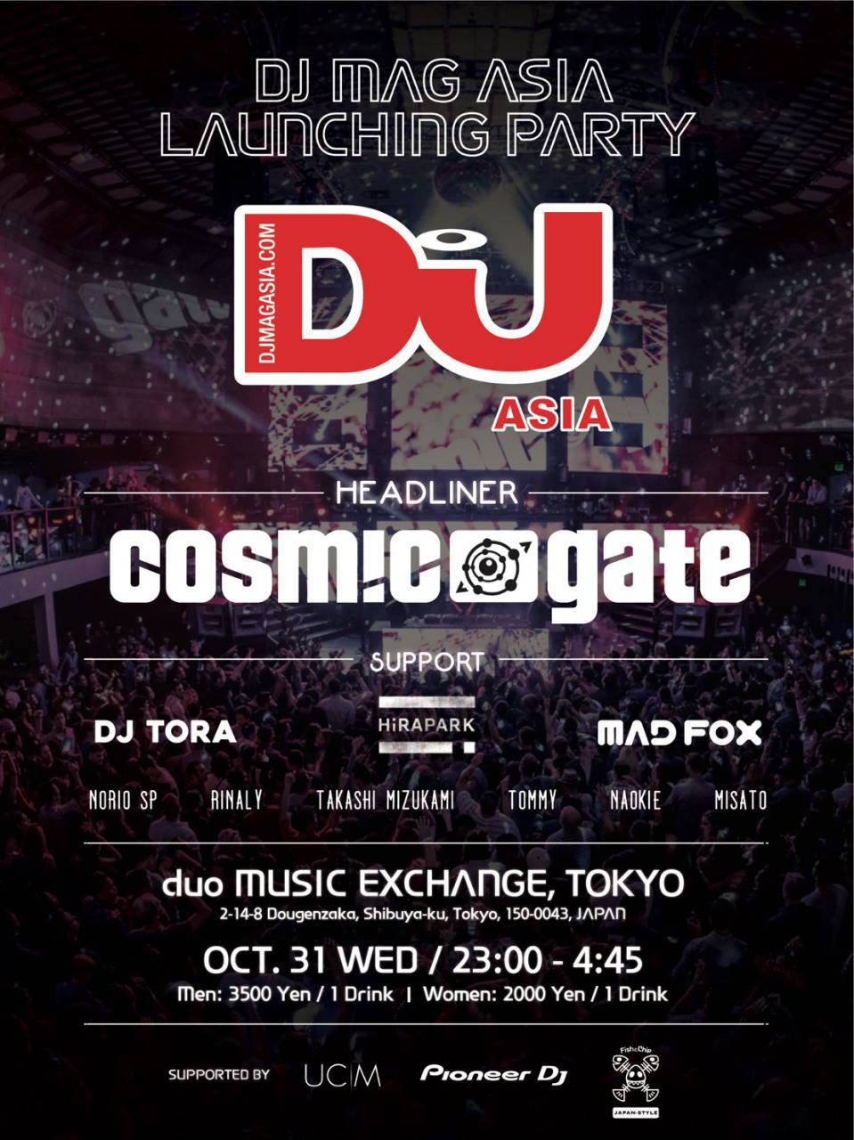 2018.10 31 OCT DJ MAG ASIA LAUNCHING PARTY EDM HOUSE TECHNO 0 Shares Facebook Twitter google Line 実券をお買い求めの方はこちらからご購入頂けます。 ¥ DATE: 2018-10-31 WED OPEN: 23:00 VENUE: PRICE: 先行 Men:3000円/1D Women:1500円/1D 一般 Men:3500円/1D Women:2000円/1D LINE UP: Cosmic Gate, DJ TORA, HiRAPARK, Norio SP, Яinaly/Rinaly, DJ TAKASHI MIZUKAMI, NAOKIE
