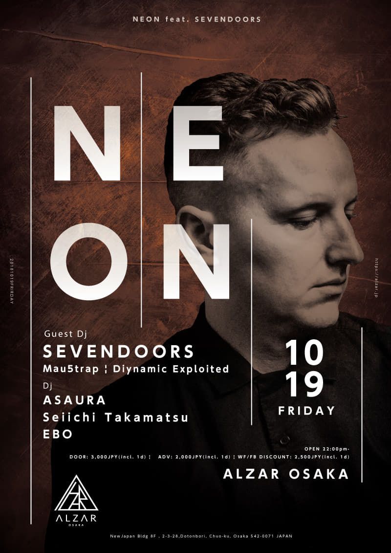 “音楽ラジオのNetflix”と言われ、イギリスの若者に絶大なる支持を誇るラジオ局BBC Radio1が今最もプッシュしているアンダーグラウンドDJであるSEVENDOORSがALZARに初登場!彼のトラックはSolomun, Scuba, AME等の名だたるDJから絶賛されているだけでなくBoiler Roomといった世界中で配信されているDJライブストリーミングでも頻繁に使用されている。当日は彼のメロディックで芯のあるテクノサウンドとNEONチームのパワフルで個性に溢れるプレイに酔いしれよう。