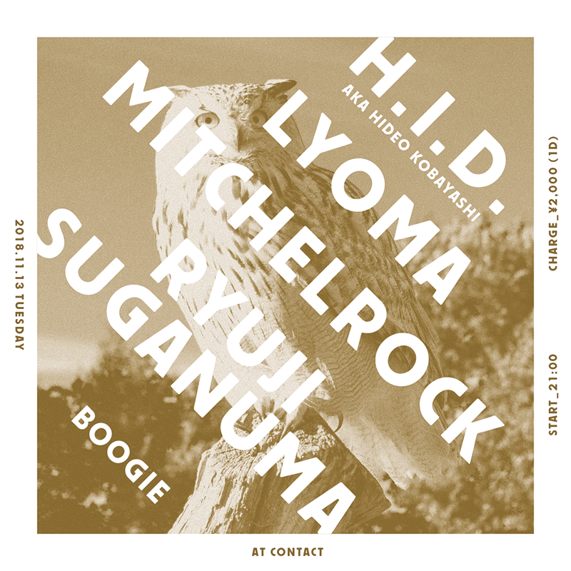 ゆく秋の感慨も一層深まる炉開きのみぎり、DJ一座BOOGIEが渋谷Contactに帰って参ります。今回は、90年代初期のジャーマンテクノに源流を発し、Nagano Kitchenで世界的に脚光を浴びたHideo Kobayashiのテクノ専有名義、H.I.D.が真打として登場。また、一座の腕利き、mitchelrockは9ヶ月振りにライヴアクトで出演いたします。この欣喜雀躍とする2本立ての脇を固めるのは、テクノでパンクでアシッドで、なおかつ肉体派な2人のDJ、LyomaとRyuji Suganuma。これはもはや、汗をかいてもいい服装と履き慣れた靴で遊びに来るほか選択の余地はありません。