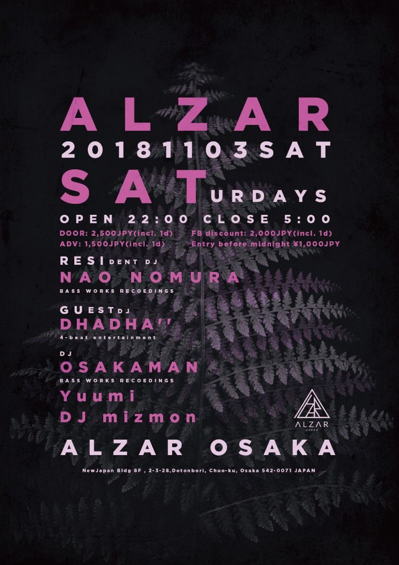 国内テクノレーベルBASS WORKS RECORDINGSを運営するNAO NOMURAが放つ毎月第1週目のALZAR SATURDAYS。 ゲストにはベルリンを拠点に活動し、毎夏IbizaでのDJを精力的にこなしているDHADHA”。そして、関西を拠点に様々なパーティーで活躍するOSAKAMAN、Yuumi、DJ mizmonが登場!!