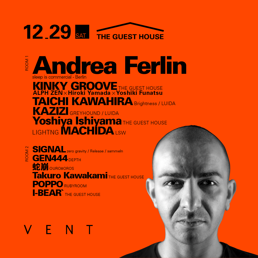 今回Andrea Ferlinが出演するのは、ALPH ZEN、Hiroki Yamada、Yoshiki Funatsuから成るDJユニット”KINKY GROOVE”が不定期に開催しているパーティーTHE GUEST HOUSE。全人類を楽しませる真のパーティーを目指し、自分たちの納得のいくタイミングでジプシーの如く場所を移動しながら開催し、今回もVENTにて開催を決定!国内最高峰のサウンドシステムを誇り、良質なダンスミュージックパーティーを発信し続けるVENTとTHE GUEST HOUSEによるコラボレーションが生み出すマジカルな一夜に要注目だ!
