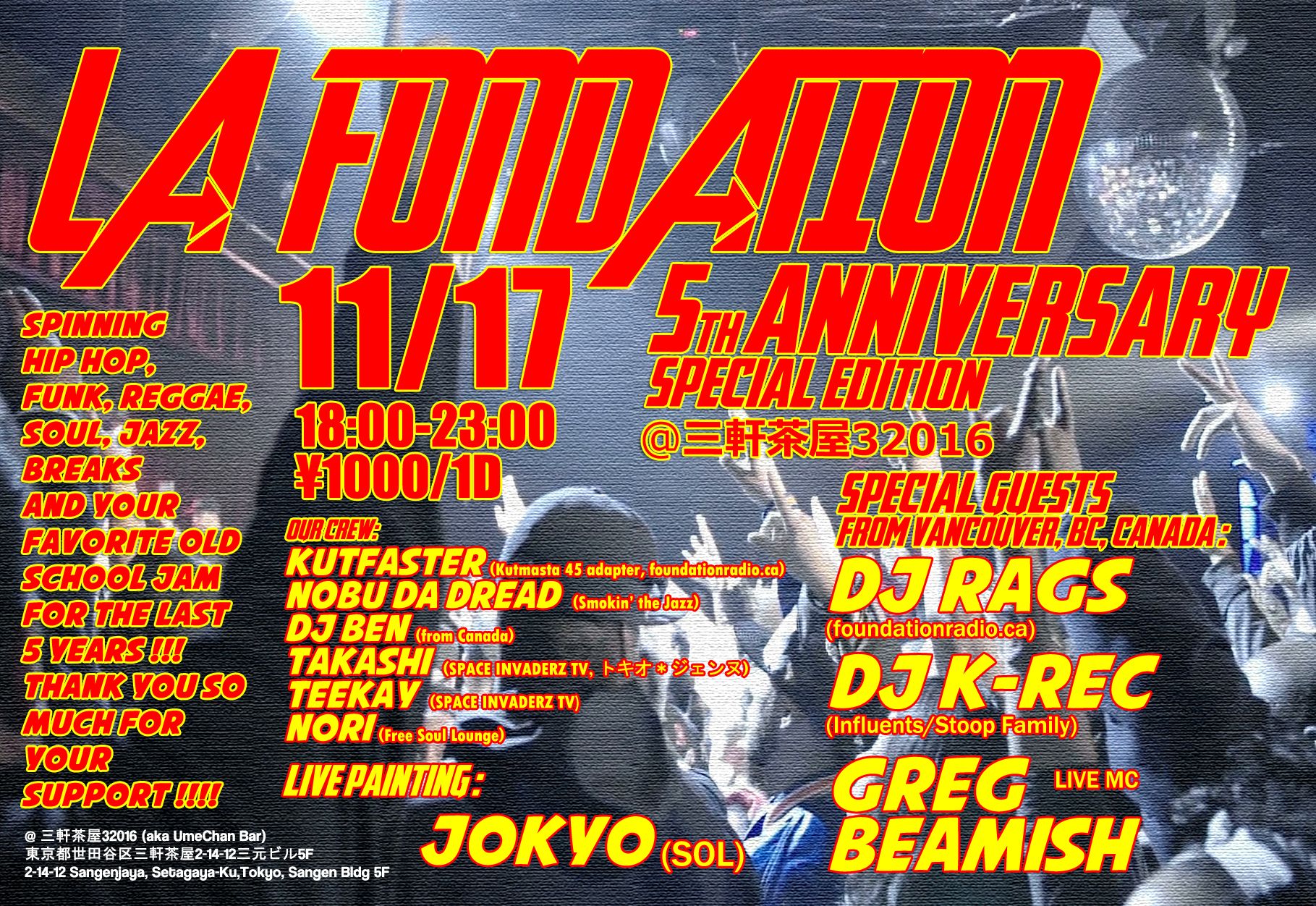 It's been already five years since we started that event called LA FONDATION. It's still an amazing experience and a hell lot of fun. Come join us to celebrate our five anniversary with our crew, awesome guests coming straight from Vancouver, BC, Canada for the event : DJ RAGS, DJ K-REC, Greg Beamish as a live MC and live painter JOKYO (for the first time).