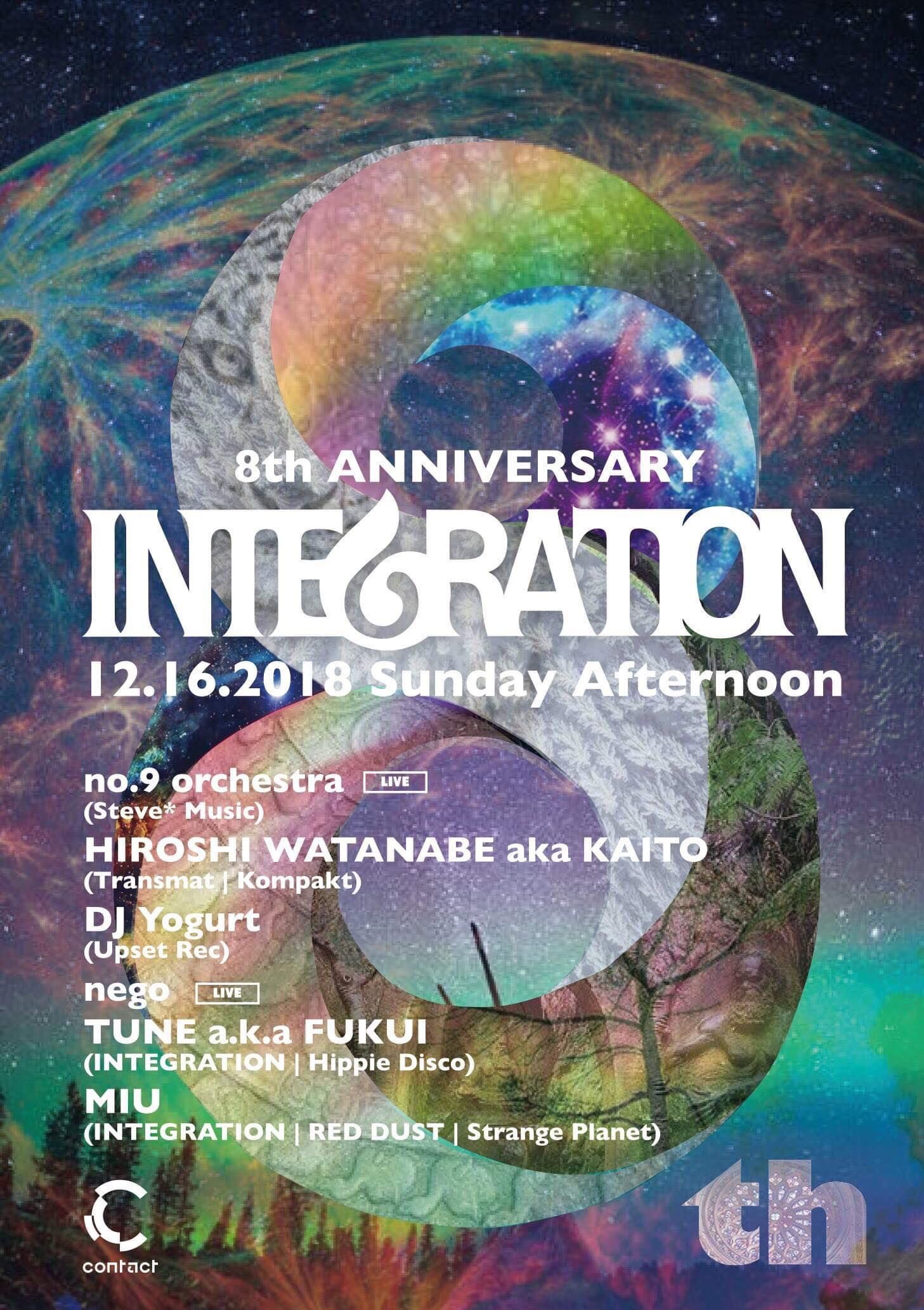 DJ、ライヴ、アートや出店など各種コンテンツの融合をコンセプトに、独自の空間を築き上げるパーティINTEGRATION。代官山AIR、Sankeys TYOを本拠地として、これまで数々の豪華ゲストをフィーチャーすると同時に、Hiroshi Watanabe a.k.a KaitoとDJ Yogurtをレジデントに迎え開催都度に盛り上がりを見せてきたこのパーティも9年目の歴史を刻もうとしている。