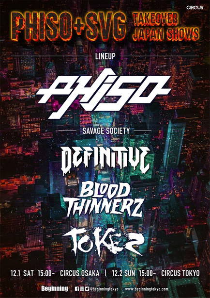 アメリカ・ロサンゼルスを拠点に活動しているDubstep/RiddimレーベルSavage SocietyのボスDefinitiveがPhiso, BloodThinnerz, Tokezを引き連れて日本にやってきます!!