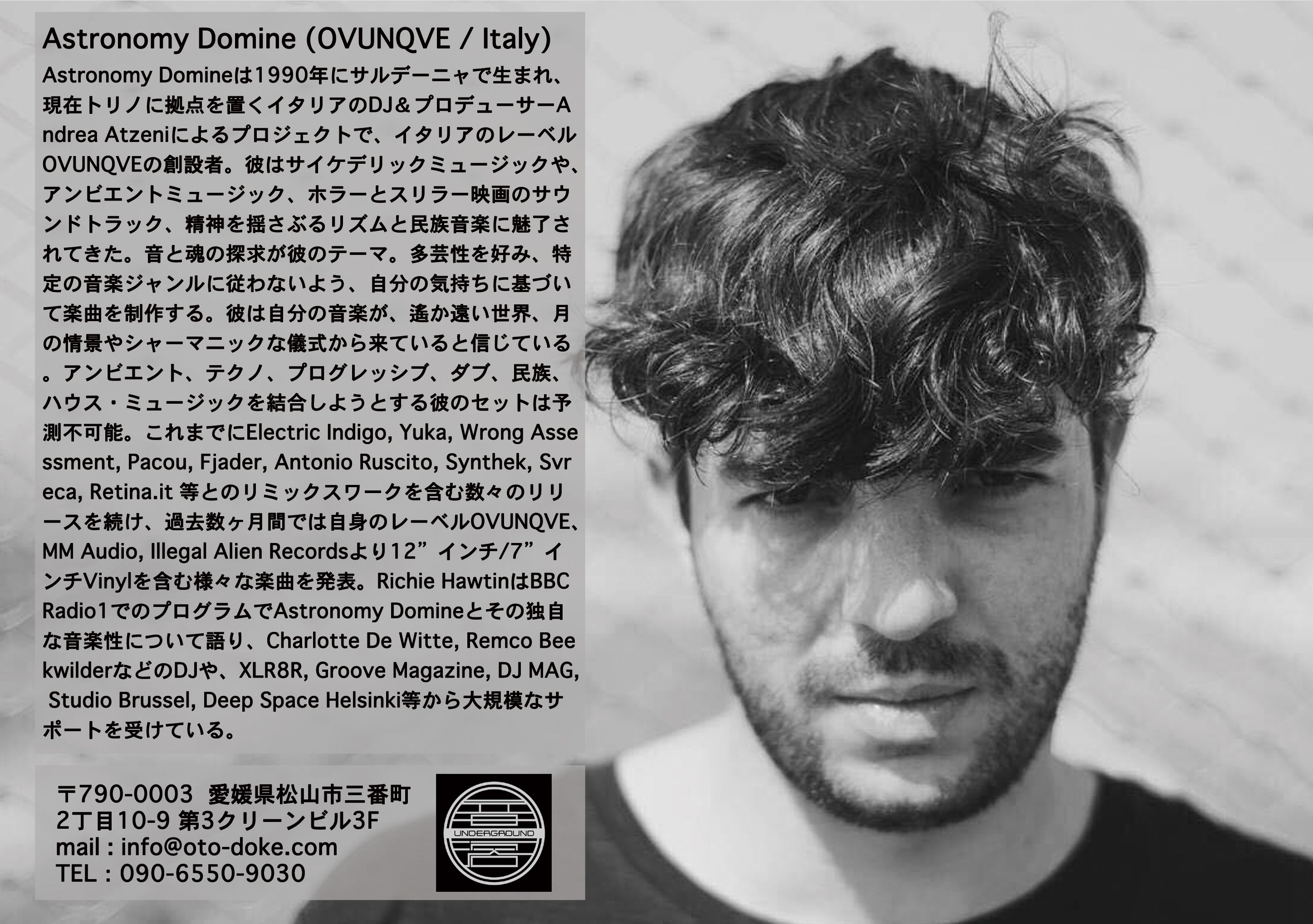 Astronomy Domineは1990年にサルデーニャで生まれ、現在トリノに拠点を置くイタリアのDJ&プロデューサーAndrea Atzeniによるプロジェクトで、イタリアのレーベルOVUNQVEの創設者。彼はサイケデリックミュージックや、アンビエントミュージック、ホラーとスリラー映画のサウンドトラック、精神を揺さぶるリズムと民族音楽に魅了されてきた。音と魂の探求が彼のテーマ。多芸性を好み、特定の音楽ジャンルに従わないよう、自分の気持ちに基づいて楽曲を制作する。彼は自分の音楽が、遙か遠い世界、月の情景やシャーマニックな儀式から来ていると信じている。アンビエント、テクノ、プログレッシブ、ダブ、民族、ハウス・ミュージックを結合しようとする彼のセットは予測不可能。