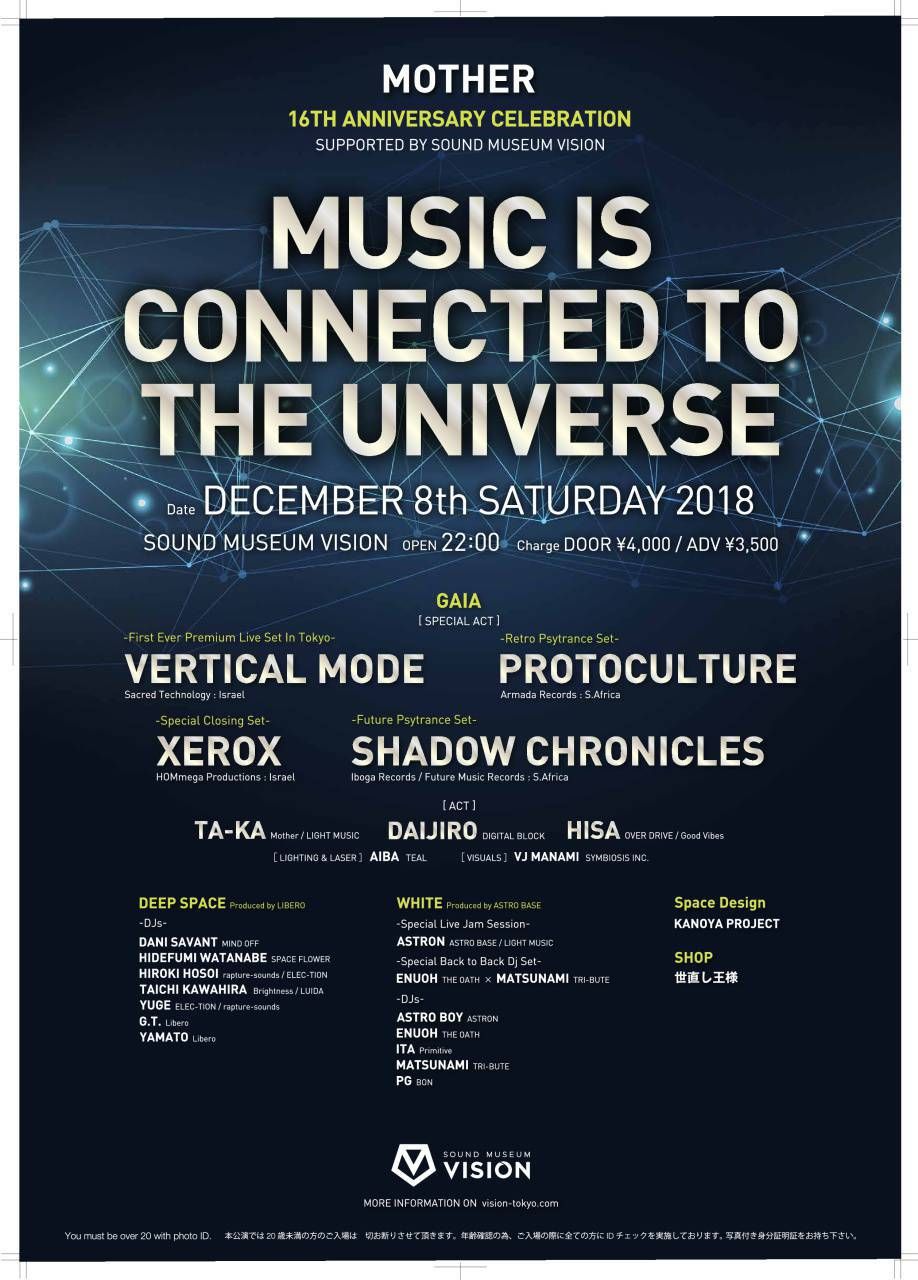 そしてMother初の開催となるSOUND MUSEAM VISINでの本公演でも、「AIBA」&「VJ MANAMI」が彩る宇宙空間の中、「DAIJIRO」から始まり、「HISA」、「TA-KA」がSPECAIAL ACTの間を彩るこの一夜限りの物語は、皆さんに”音楽の素晴らしさ“と”パーティーの楽しさ“を届けられたらと思っております。