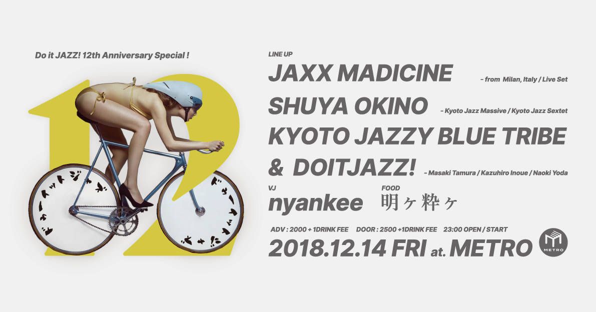 2006 年 に始動以降COLLAGEそしてMETROへと場所を 変え、クラブ以外でも屋上のルーフトップやカフェ・バー、ラウンジ、ショップレセプション、 国際写真展とのコラボレーション等活動を広げ、日本、世界の著名DJを招待し、京都のJAZZ/CROSSOVERミュージックを発信し続けてきた、"DoitJAZZ!"、今回で12周年を迎えます。今まで色々な方々にサポートして頂きここまで来れました。そして僕たちは世界の素晴らしいアーティストの素晴らしいプレイ、僕たちの大好きな音楽をレコードを通じて感謝の意をお返ししたいと思います。イタリア・ミラノからジャジーかつスペーシーなサウンドで、「Local Talk」からのリリース、沖野修也率いる「Kyoto Jazz Sextet 」のリミックスが話題となっている「Jaxx Madicine」がLive Setを披露されます。そして「Kyoto Jazz Sextet」沖野修也が登場しリミックス作品と同じくイタリア×京都の共演がメトロにて実現しました。 世界を飛び回るダンス アーティスト "田辺 美地徒"率いるダンス&パーカッションショーケース"Kyoto Jazzy Blue Tribe"のパフォーマンスとDoitJAZZ! DJsによりお送りするスペシャルな夜をお楽しみください。