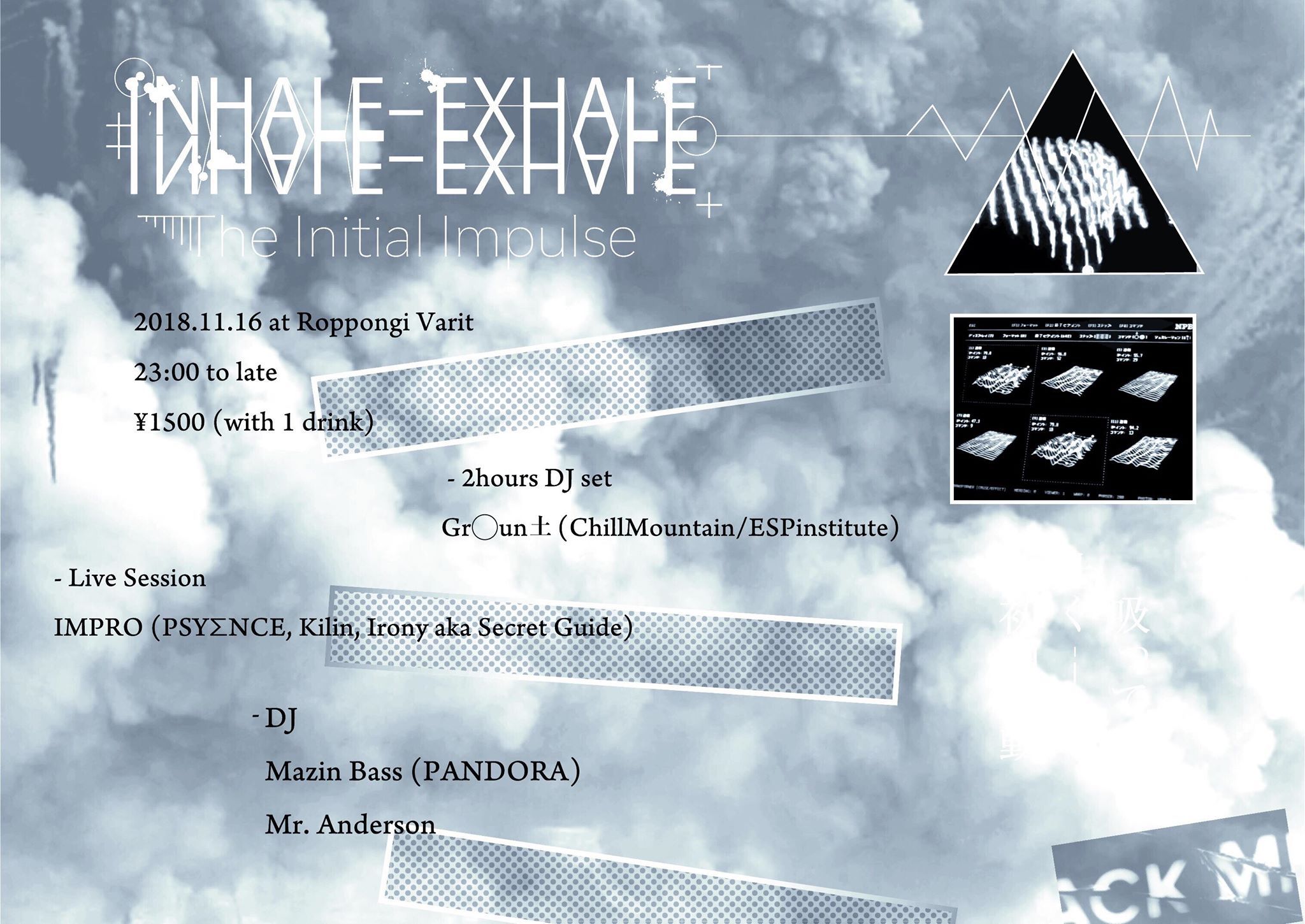 - Guest DJ Gr◯un土 (ChillMountain/ESPinstitute) - 2 hours DJ set / Improvisation Live Session IMPRO (MC PsyΣnce, Kilin, Irony aka Secret Guide) / DJ Mazin Bass (PANDORA) /DJ Mr. Anderson / Food バキトマ堂 (激ウマ・ビリヤニ) / Shop 異次元民芸創作所 (frasco)