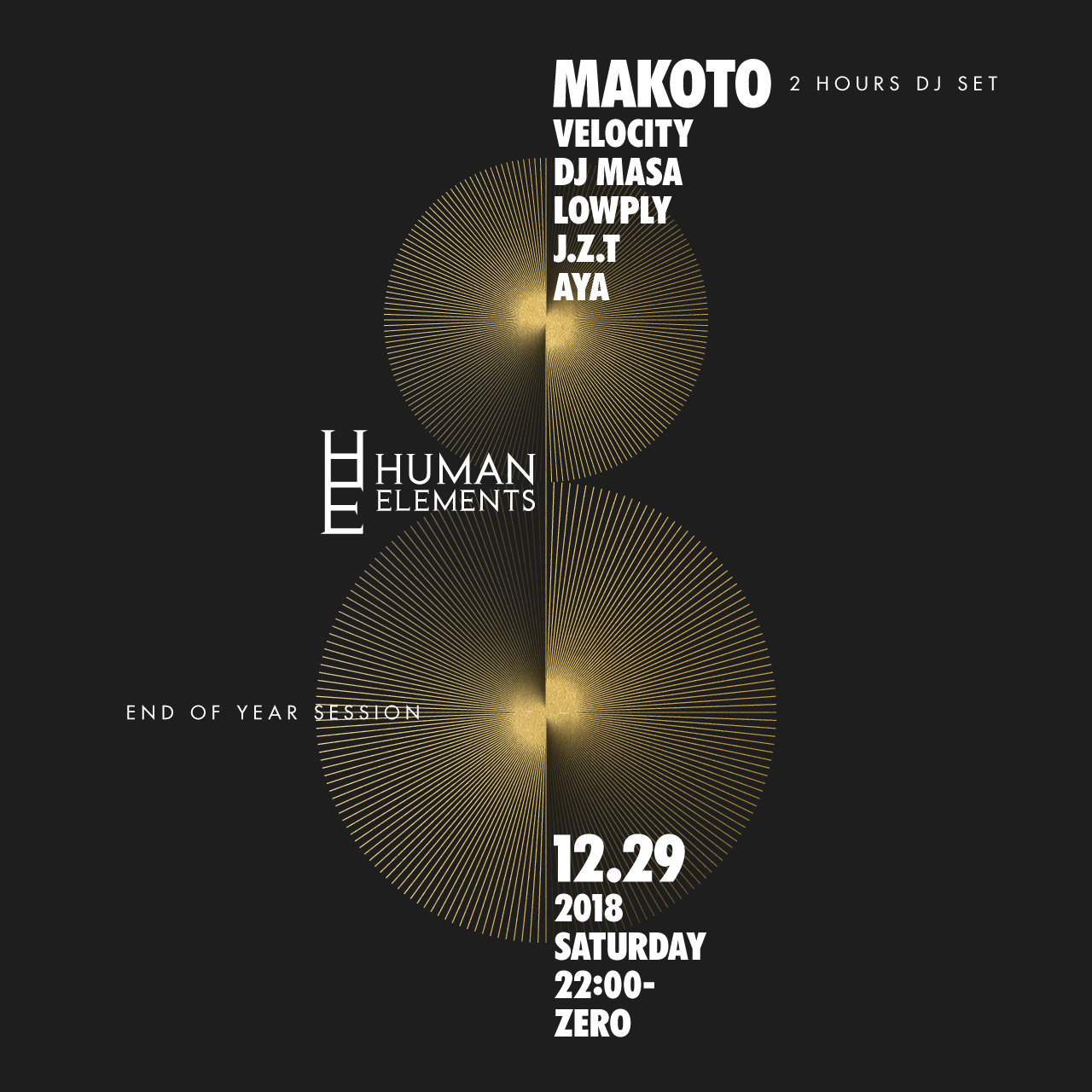 2018年より新たなフェーズへと歩みを進めた Human Elements。UK 移住以降、今まで以上に多忙を極める Makoto が帰国し、貴重な 2時間セットを披露! 2018年の最後を飾る Human Elements “End of Year Session” で、世界水準の音楽をぜひ体感して欲しい。