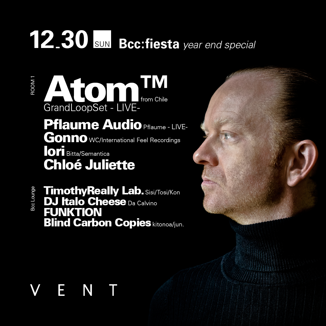 今年の6月に衝撃の新ライブセット” Deep State ”をVENTで披露した鬼才、ATOM™が年末にカムバック!ATOM™、ATOM HEART、Señor Coconut、FLANGERな ど多くのアーティスト名義を使い分け、エレクトロニック・ミュージック界において一際異彩を放つアーティストの東京公演をサポートしてきた、アートの視点で音楽を楽しめる新感覚なイベント” Bcc:Fiesta “のメインアクトとして12月30日に再び登場する!