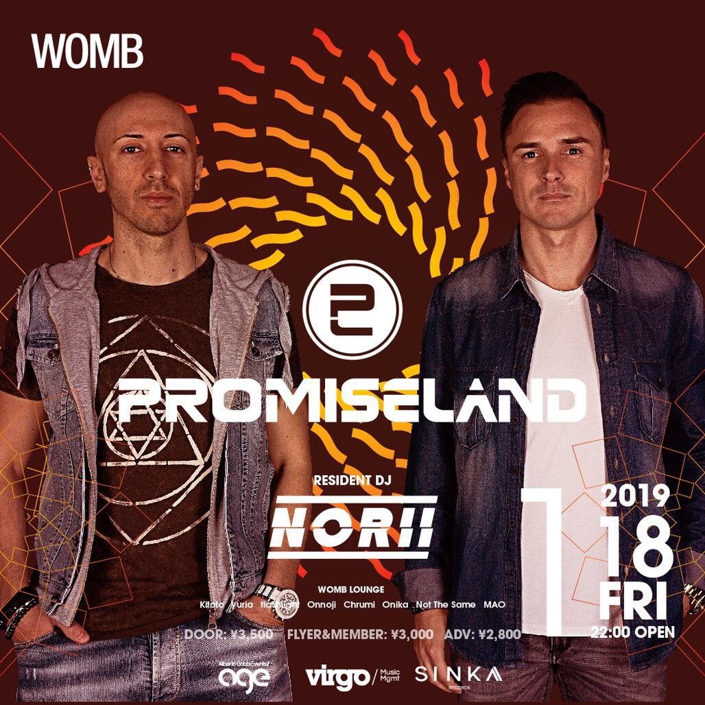 今までにも KRYDER、TOMSTAAR、D.O.D、TEAMWORKS とブッキングが困難なアーティストを数多く招聘し WOMB を大いに盛り上げてきた今回のスペシャルゲストはイタリアのデュオ! 常にダンスミュージックシーンの先頭にたち、ながらく来日が待たれていた PROMISELAND が初来日!! そして Resident DJ は全国各地、そして Ultra Europe、ADE など海外でも活躍する、現在リアルな音楽を世界に発信している NORII が務める。