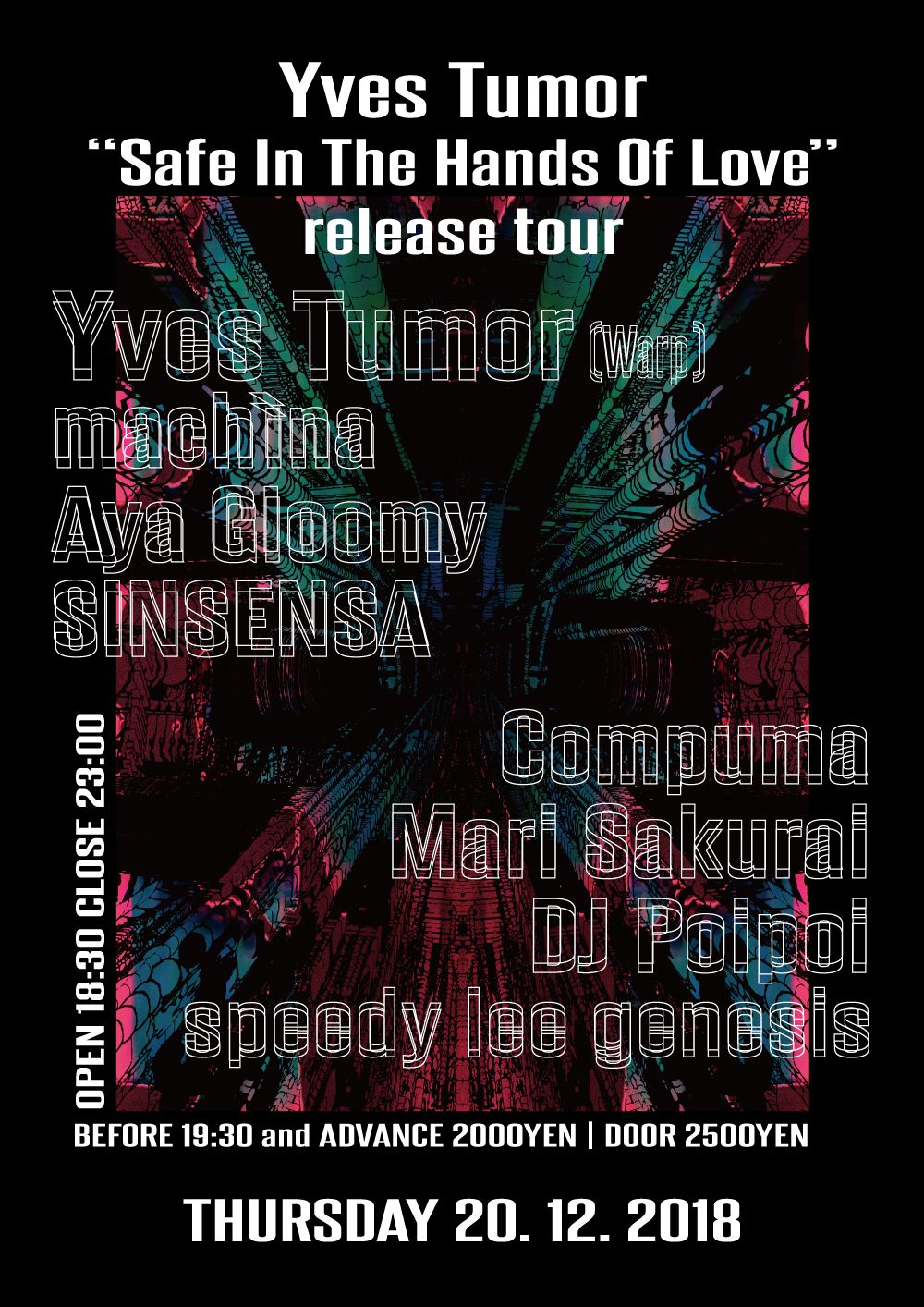 名門レーベル“Warp”の期待の新星Yves Tumorが待望の初来日! 電子音楽、クラシック、ポップなど、多彩なスタイルを取り込んだ怪作「Safe In The Hands Of Love」で注目を集める2018年の最重要アーティストが、抑圧からの解放を求めて叫びをあげる。ソングライティングとサウンドの在り方を極限まで追求し、音楽の常識を覆す予想外のライヴパフォーマンスは、エレクトロニックミュージックの未来を見せてくれるだろう。