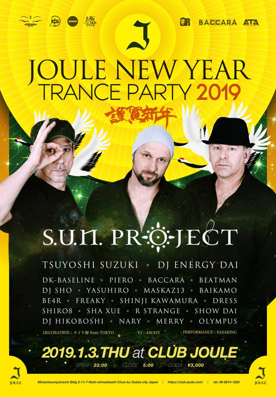 2019年1月3日 (木)、大阪アメリカ村のランドマーク Club joule にて、ドイツより Psychedelic Trance / Goa Trance シーンの先駆者 SUN PROJECT が、CLUB JOULE NEW YEAR TRANCE PARTY 2019 に来日出演が決定!