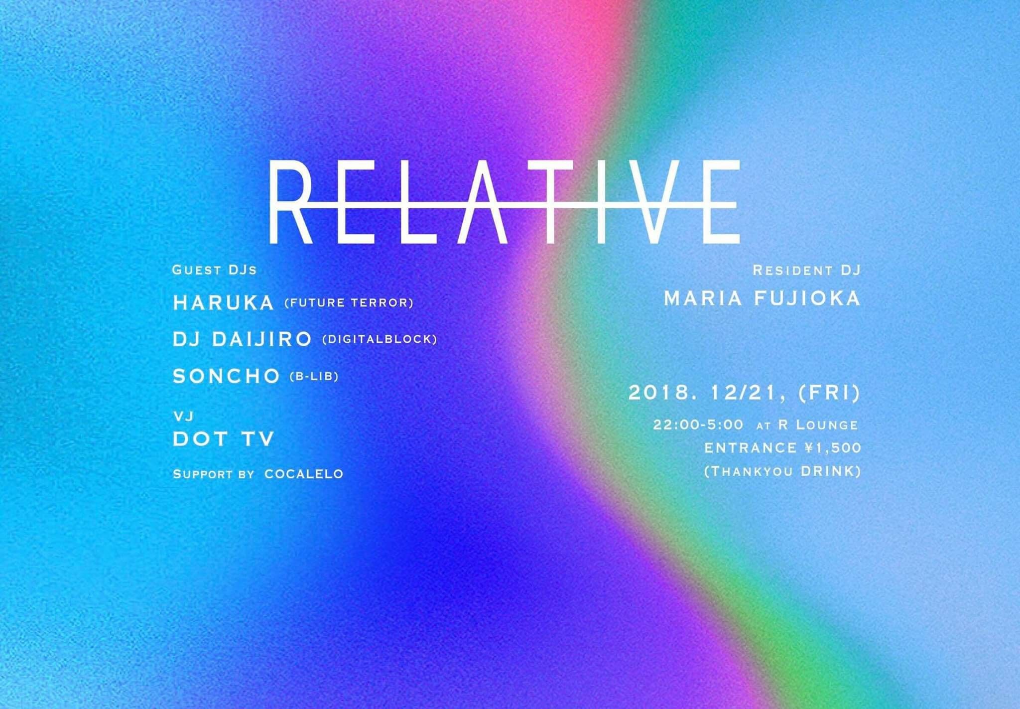 2018.12 21 DEC RELATIVE TECHNO 0 Shares Facebook Twitter google Line DATE: 2018-12-21 FRI OPEN: 22:00 VENUE: PRICE: 1500 LINE UP: DJ : Haruka (FUTURE TERROR) / DJ DAIJIRO (DIGITALBLOCK) / soncho(B-LIB) RESIDENT DJ : MARIA FUJIOKA VJ:DOT TV