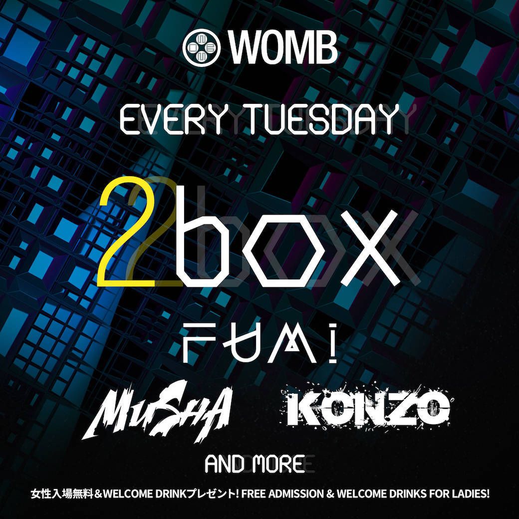 WOMB の火曜日にお送りするパーティーその名も2BOX。ラインナップには WOMB のレギュラーパーティー N_U_O のレジデント DJ を務め年間250~300本のパーティーに出演し、若者からの圧倒的な支持を受けている今最も注目すべき若手 DJ の FUMI を筆頭に都内で活躍する DJ が勢揃いし ”ALL GOOD MUSIC PARTY” をテーマにするこのパーティーに目が離せない!