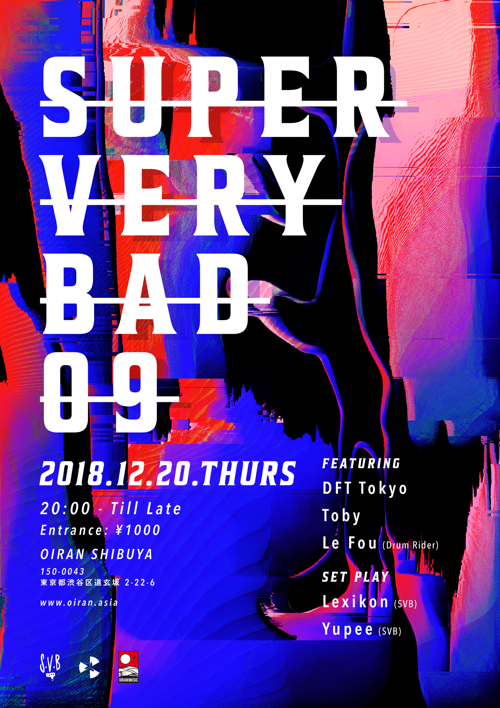 SUPER VERY BAD, a "high tech soul" event originating in Shanghai in 2015 between an uncensored East Asian collective of DJs, musicians, artists and architects will present its ninth edition in the house of Oiran in Shibuya, Tokyo. The unusual night will feature arguably the highest levels of trippiness in town, featuring DJ sets from acclaimed female production duo DFT Tokyo (JPN) , Japanese techno veteran and icon Toby and American underground techno producer Le Fou (Drum Rider, STRRR TV). Local talents Lexicon (SVB) and Yupee (SVB) will also strut their skills and provide choice selections . Expect a tasteful yet eclectic blend of Detroit x Berlin techno, experimental, ambient, juke, future bass/trap and beyond at one of the most intimate venues in Tokyo!