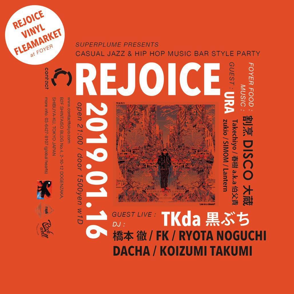 Rejoiceは選曲家 橋本徹、Nujabesのマネージャーやレーべルマネージメントを務め、現在は〈roph recordings〉をマネージメントするKoizumi Takumi、〈Hydeout Productions〉の旗艦店〈Tribe/Guinness Records〉からリリースし、同店のスタッフでもあるFKを中心に、腕利きのセレクターが音楽を担当する。“等身大かつ自分達にとってリアルなジャズやヒップホップ”、“本当に音楽を愛する人たちが安心して和める場所”をコンセプトに掲げ、ジャズ、ヒップホップを中心に良質な音楽を気ままに楽しめるイベント。