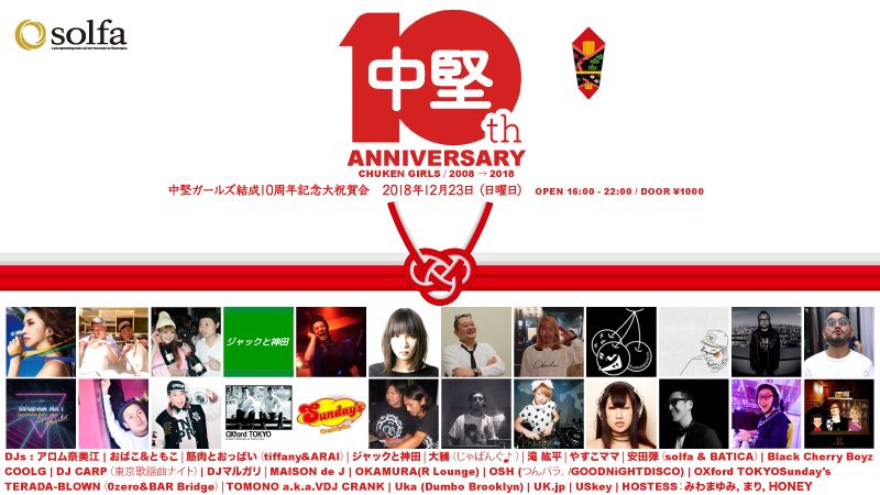 つきましては、来る2018年12月23日(日曜日/三連休中日)に、同じく今年10周年を迎えた中目黒のクラブ「solfa」で、これまで中堅ガールズがお世話になった皆さまと共にささやかながら結成10周年記念パーティーを開催する運びとなりました。