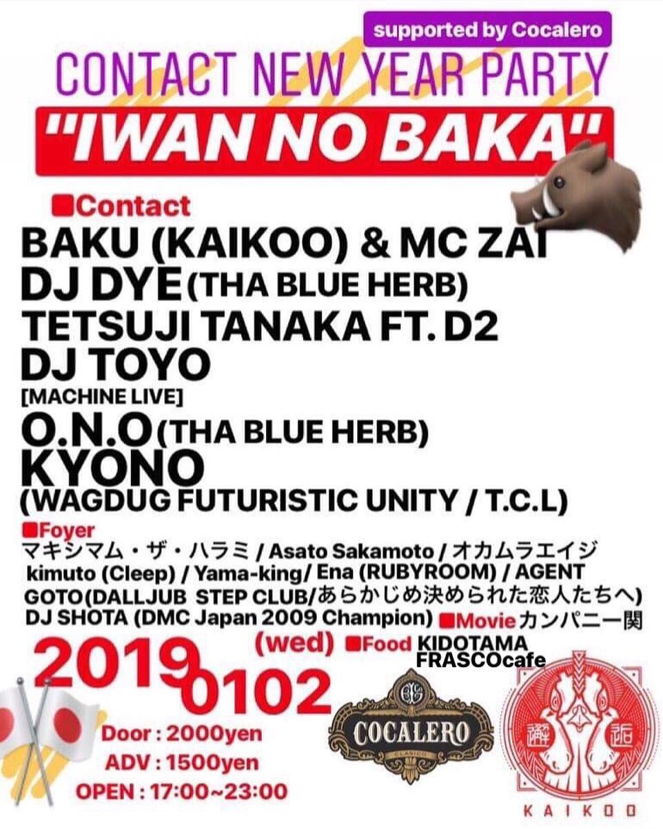 北海道より説明不要のTHA BLUE HERBから、O.N.OとDJ DYEの音の魔術師をゲストに迎える。更に満を辞して1stアルバムをリリースしたロック界のレジェンド、KYONOがDJセットで参戦。お馴染みドラムンベースの重鎮、TETSUJI TANAKA、DJ TOYO、サイドMCにZAI、D2を迎え、最新のダンスミュージックと美味しいお酒で2019年新年1発目のContactを盛り上げる。